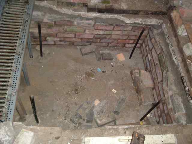 • The steam hammer foundations have been progressing. After the timbers had been removed, it was found that the sides of the hole were just the earth infill. Damp from the earth had been absorbed into the wood causing it to rot. The hole has now been brick lined.