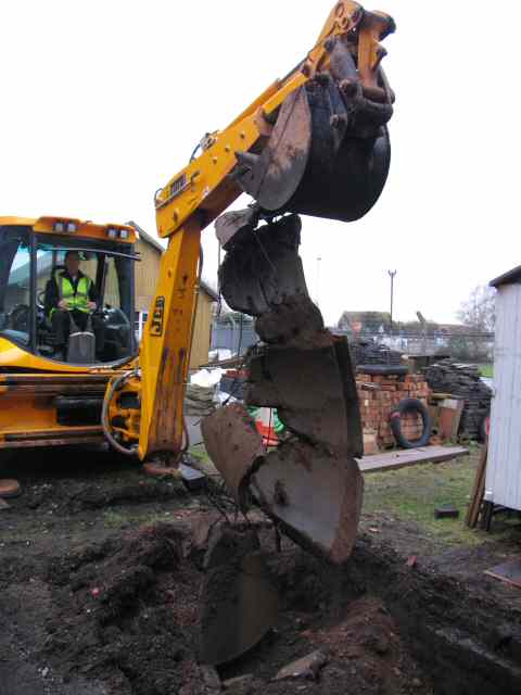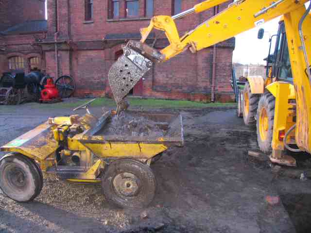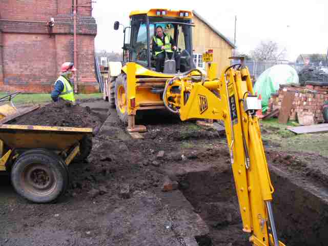 • One of our ongoing projects is to fully excavate the sewage culverts in order to provide a larger volume of cooling water for the beam engines. This took a major step forward this month with the help of JCB, who provided a digger and driver to excavate 'D' pit and the adjacent 'blowdown' pit. The pits had been filled with all sorts of builders rubble. Our dumper worked hard removing the spoil and it got very sloppy when we eventually got down to the water table. Severn Trent also provided a couple of lorries to remove the spoil on the 2nd day.