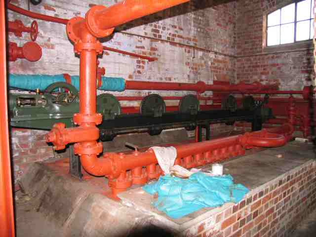 • The steam main has now been connected to 'E' Engine House. The picture shows the connection being made in the bowels of CD Engine House. The major parts of the storm water pump have also been roughly positioned to allow pipework routing to be worked out. The left hand end of the picture shows the condensor, which we believe was not actually used during the working life of the engine.