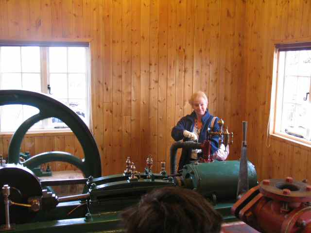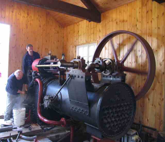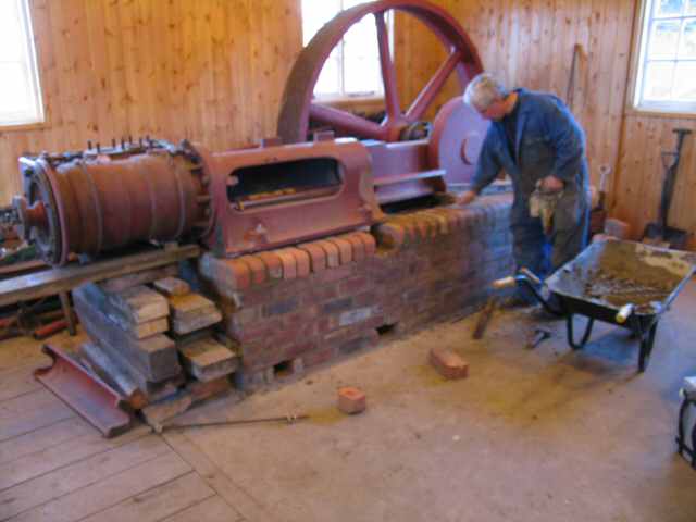 • In 'E' engine house, the main engines are just about ready for our official opening in October. The portable has had a box built under it to simulate how it was embedded in the concrete floor in the original lime shed. The storm water pump and agitator engine are also complete.
