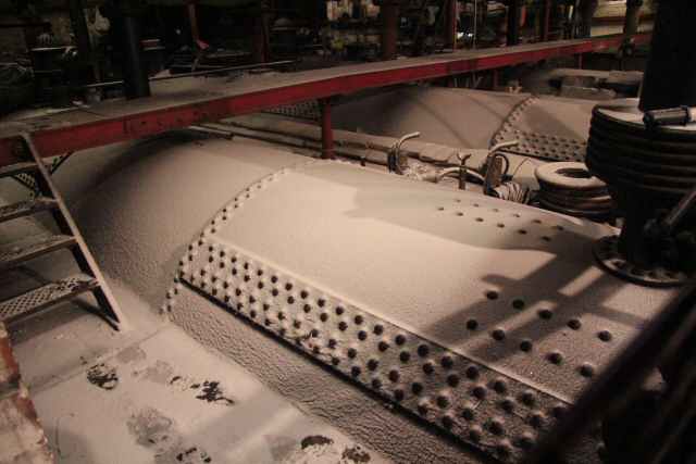 • When it snowed this month, the wind was blowing such that the snow came into the boiler house through the roof vents. Here is a picture of the top of boiler 1.