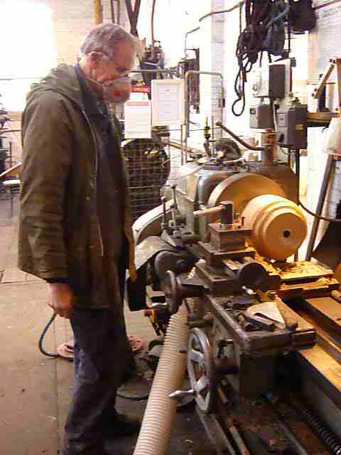 • More parts for B engine are being manufactured. Here is a bearing which will be located inside the governor pedestal. The pattern for the governor weights has also been turned.