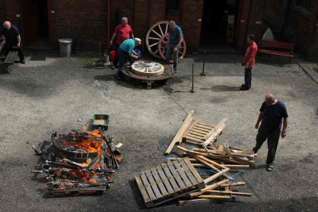 • The iron tyres have been fitted to the pipe drug wheels. The tyres were heated in a fire and then lowered over the wheel which was fastened to the large wheelwright's platform. The wheel is then cooled down to shrink the tyre onto the wheel.