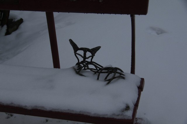 • When it snowed this month, the wind was blowing such that the snow stuck to one face of the chimney. Here is a picture. The cat (see July 2012) was feeling a bit chilly too!