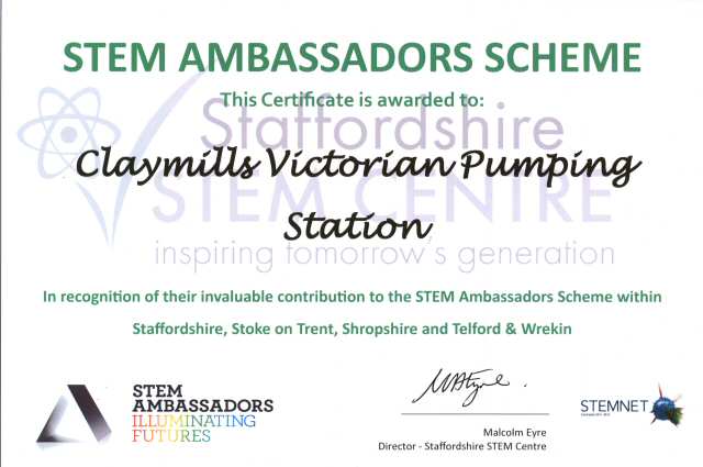 • Claymills has received an award "In recognition of their invaluable contribution to the STEM Ambassadors scheme within Staffordshire". (STEM = Science, Technology, Engineering and Mathematics programme) Thirty volunteers have become STEM Ambassadors and have enhanced CRB clearance to work with school pupils.