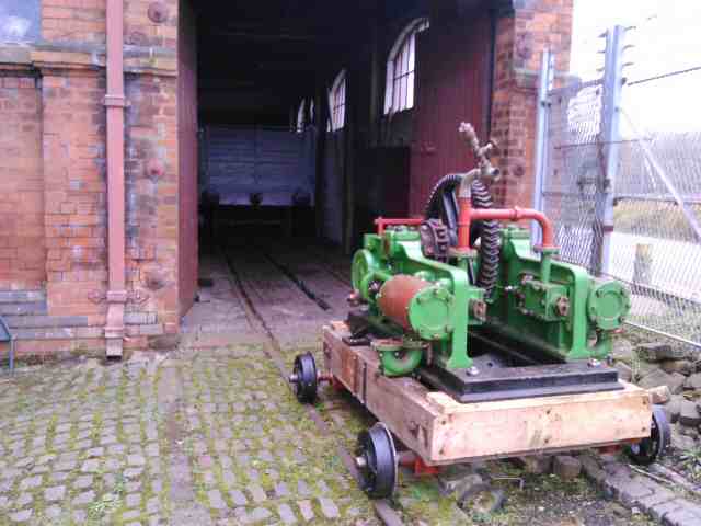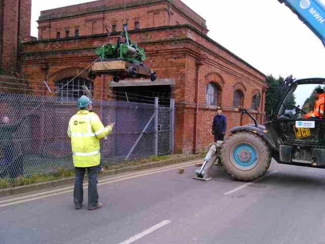 • The steam winch has now been moved to the boiler house with some help from MWH's telehandler. The winch has been mounted on a trolley which runs on the railway tracks. This will allow it to be positioned to give demonstations of moving the coal wagons in the boilerhouse.