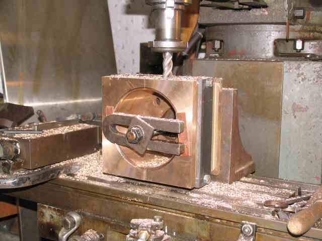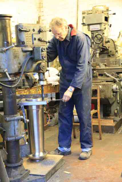 • The replacement centre column for B engine governor has been machined. The fixing holes in the base are being drilled here.