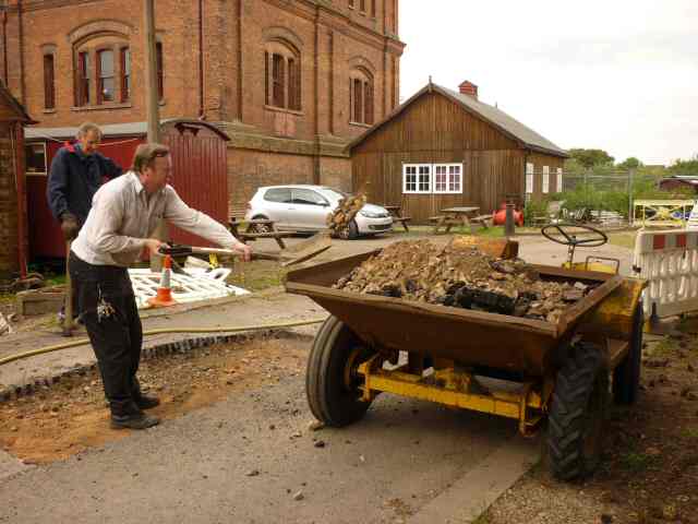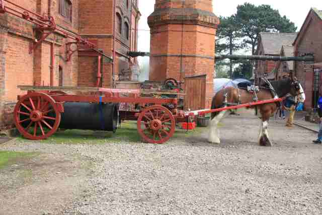 • The pipe drug has been moved from the position where most of the restoration work took place. A horse is shown here hitched up to the pipe drug for the first time in many years. Unfortunately, during the move some serious rotted timber was discovered and it was deemed unsafe for the horse to move it. Further major restoration work will be required.